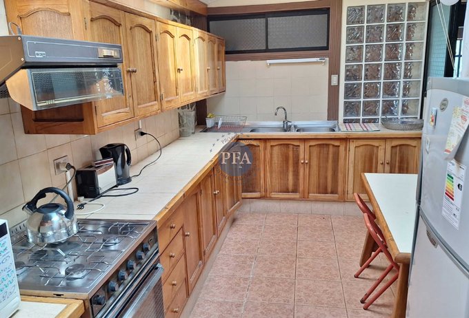 - Cocina tradicional full equipada con cocina, horno, refrigerador. Muebles de madera, piso y muros con cerámica.