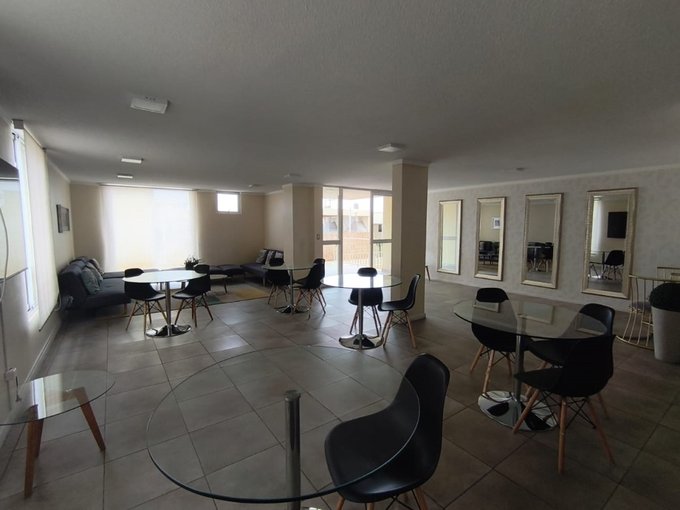 Sala multiuso amplia con living cómodo, mesas y sus sillas para compartir, mesón, microondas, refrigerador y Plasma.