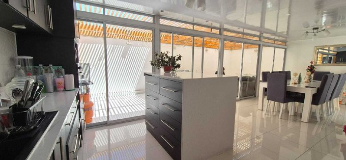 Dispone de una elegante sala de estar y un comedor de buen tamaño, ideales para la vida diaria y para recibir visitas. La cocina se encuentra equipada y presenta modernas terminaciones, con encimera de mármol y pisos de porcelanato que aportan un estilo contemporáneo.