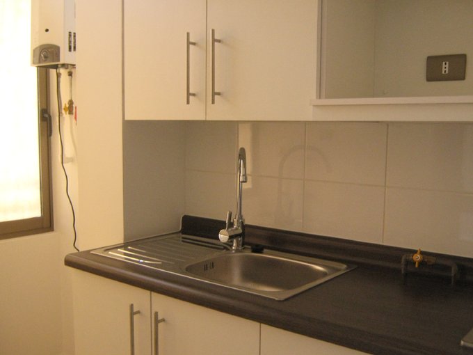 El departamento cuenta con cocina americana con loggia, muebles empotrados, mesón, encimera, horno, calefont