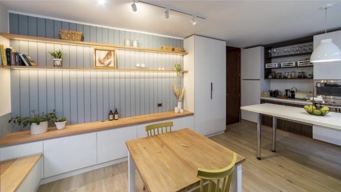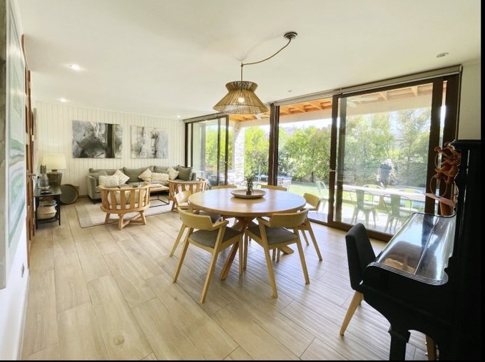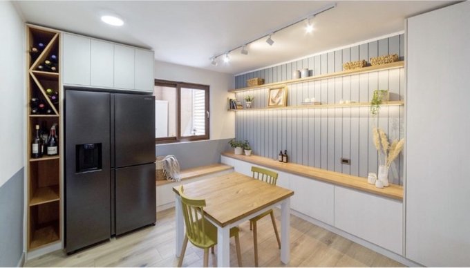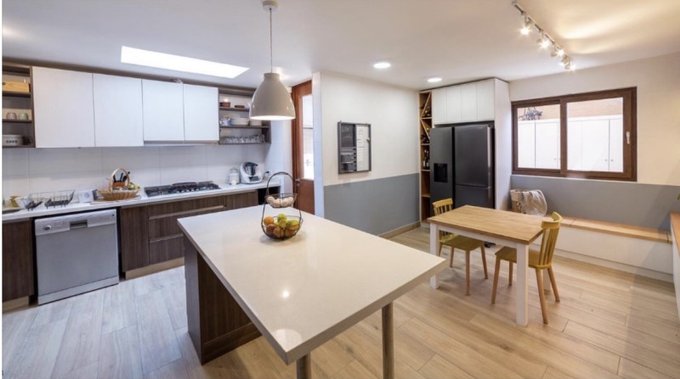 - Moderna cocina integrada y remodelada con una sala de estar increíble para compartir en familia y conexión directa al comedor. Equipada con encimera y 5 quemadores a gas, horno empotrado, espacio para refrigerador de 2 puertas , espacio central para comedor de diario,
