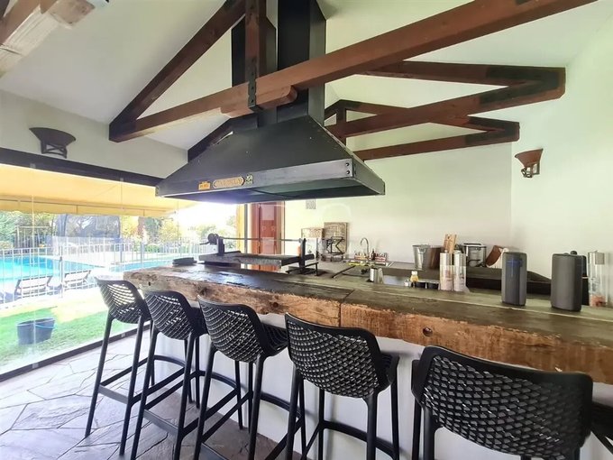 * Quincho cerrado con cristal plegable y ventanales termopanel, vigas a la vista, muros de piedra, piso de piedra.