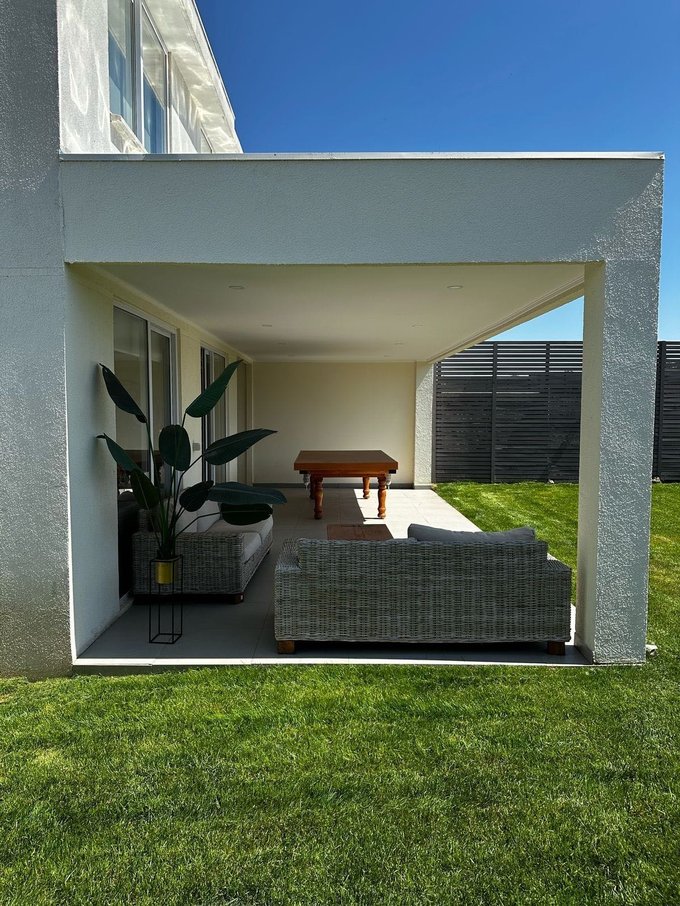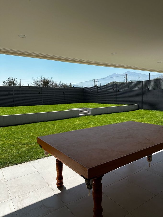 Amplia terraza techada con mesa de Pool, jardín formado con riego automático, estacionamiento para dos vehículos.