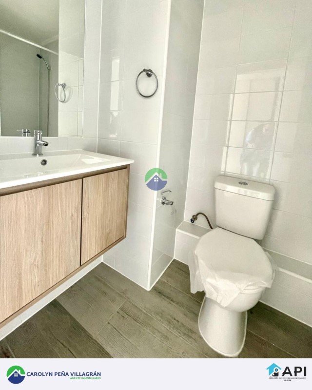 Consta de 2 dormitorios y 2 baños (en suite), cocina integrada amoblada y equipada con horno, encimera y campana, balcón de 8 m con hermosa vista. Incluye focos, cortinas y conexión para lavadora.