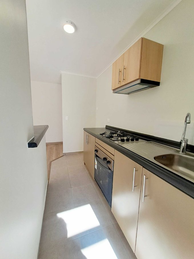 - Cocina americana, que cuenta con muebles, horno eléctrico, encimera y campana.