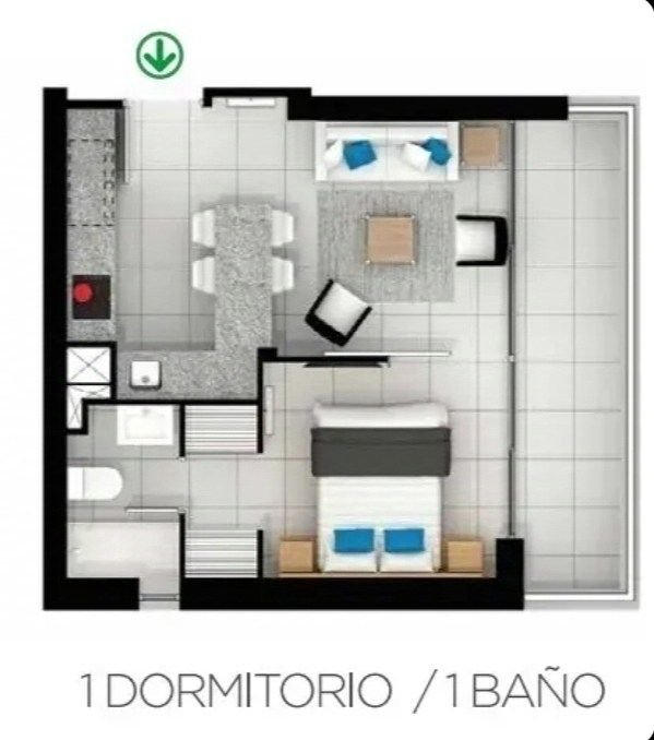 El departamento de 35m2 (+ superficie terraza) cuenta con un dormitorio, 1 baño, terraza cerrada a todo lo largo del departamento y cocina abierta equipada.