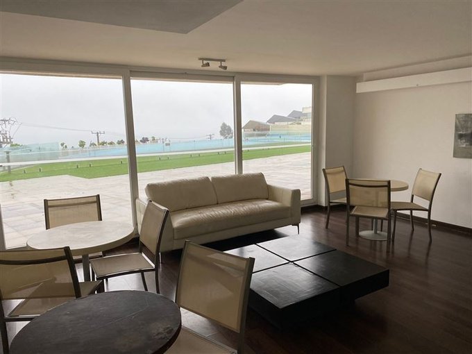 Amplio living comedor con vista al mar y piscina al aire libre.