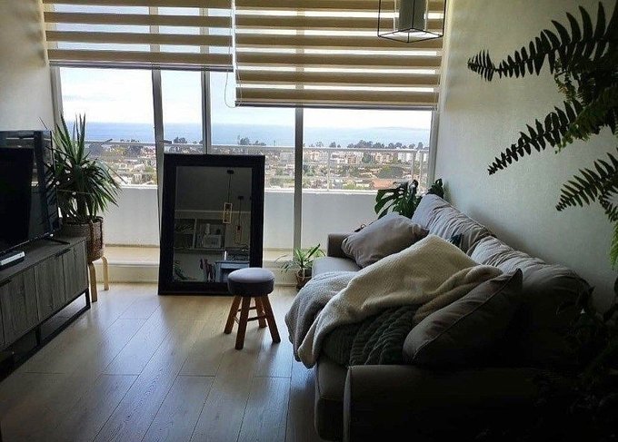 Departamento amoblado con vista Poniente en sector de Lomas de Montemar Concón, para disfrutar de preciosos atardeceres. Tiene living comedor con cocina abierta, estilo mariposa dos dormitorios en suite e con terraza completa vista poniente al mar, un estacionamiento.