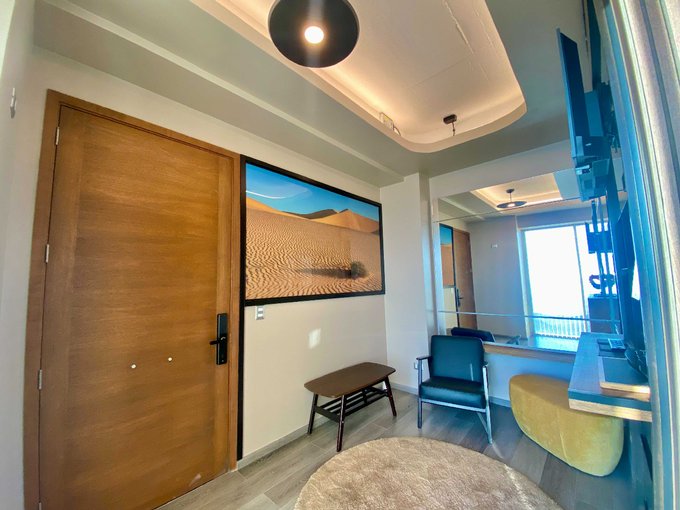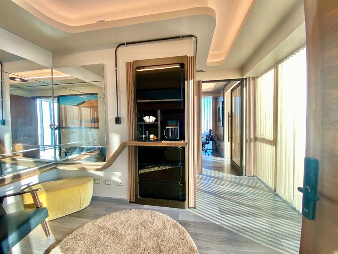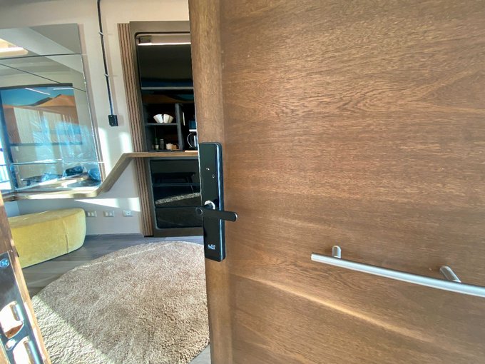 Se ubica en un piso 13 de un edificio de 18 pisos, posee una elegante y amplia puerta, chapa de seguridad electrónica. Lugar de estilo Industrial. Posee luminaria de variadas y diferentes intensidades, Cristales Termopanel de cielo a piso, con filtro atenuador de calor, además de Cortinas persianas verticales.