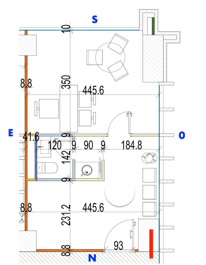 A continuación avanzas a un pasillo que contiene mobiliario para guardar insumos , mas Kitchenette, para luego acceder al baño.