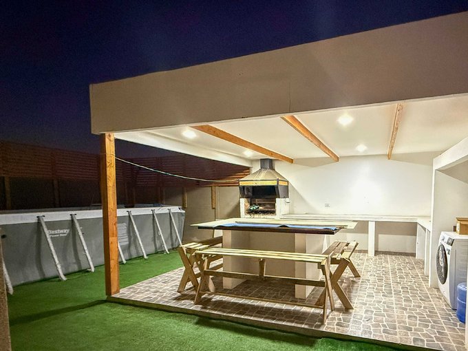 En el exterior, la casa destaca por su patio cerrado, quincho con parrilla de ladrillo y mesón de granito, perfecto para reuniones, además de piscina estructural para disfrutar en temporada. También dispone de estacionamiento privado.