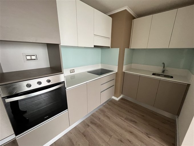 Cocina americana con cubierta de cuarzo, vitrocerámica, campana retráctil, y horno eléctrico