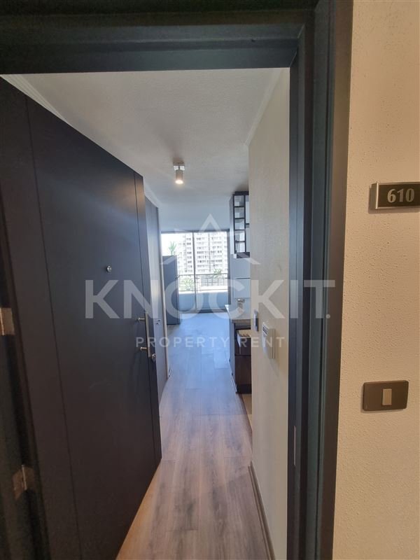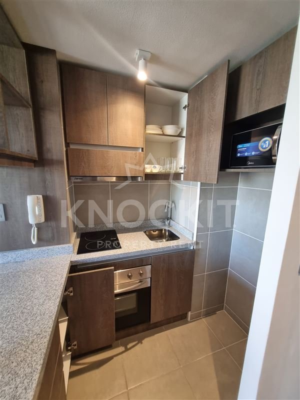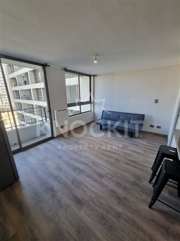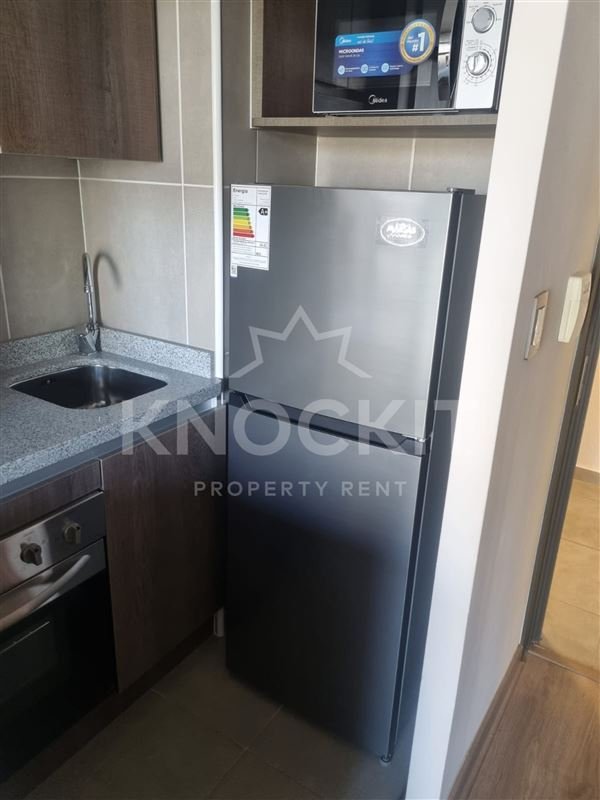 Se Arrienda departamento 1D1B Amoblado; Cocina equipada con Horno Eléctrico, Microondas, Refrigerador, Encimera de Vitrocerámica, Estantes, Repisas y Gabinetes; Living Comedor con acceso a Balcón y equipado con Futón.