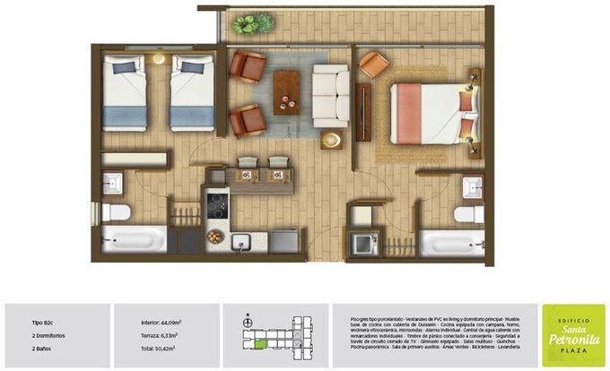 La Cocina americana equipada con campana, horno, encimera vitroceramica, microondas y mesón, Living con salida a la terraza, Dormitorio principal en suite, amplios closet, Dormitorio secundario capacidad para una cama de 2 plazas, 2 baños completos, Pisos de porcelanato y Ventanas de termopanel, y cuenta con conexión para Lavadora