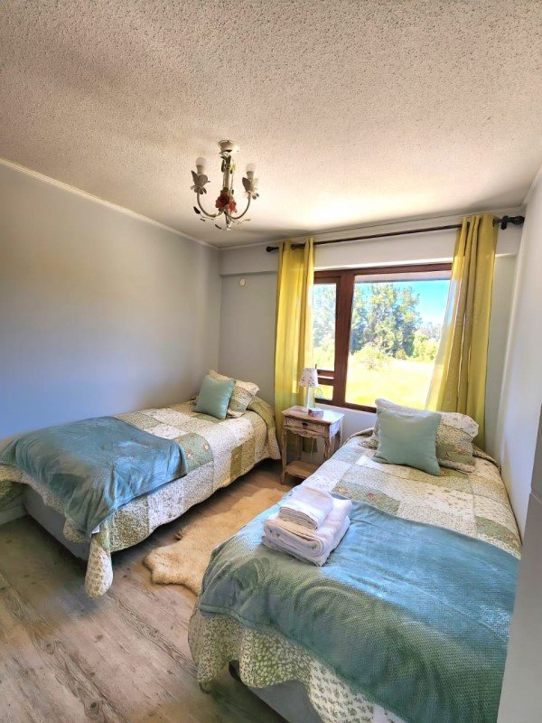 Hacia la derecha se encuentra un pasillo de distribución que comunica con un baño de visitas completo con tina, luego una pieza (para dos camas) con closet, al final del pasillo se encuentra la pieza principal en suite con clóset y vistas verdes.