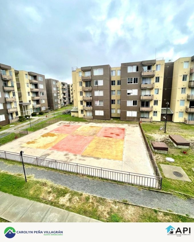 El edificio cuenta con conserjería 24/7, zona de juegos infantiles, cancha multiuso y áreas verdes.