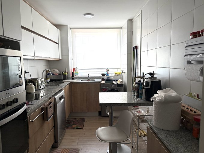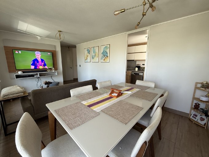 El departamento tiene 3 dormitorios y 2 baños. Dormitorio principal en suite, con walking closet y terraza independiente. Hall de acceso, living comedor con salida a agradable terraza. Sala de estar. Cocina independiente con comedor de diario, amoblada con cubiertas de granito y equipada con campana, encimera y horno eléctricos. Instalación para lavadora. Ventanas de termopanel en todo el departamento y terrazas. Piso de porcelanato en todo el departamento. Se entrega con cortinas roller y lámparas en puntos de luz.