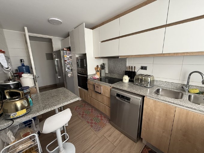 El departamento tiene 3 dormitorios y 2 baños. Dormitorio principal en suite, con walking closet y terraza independiente. Hall de acceso, living comedor con salida a agradable terraza. Sala de estar. Cocina independiente con comedor de diario, amoblada con cubiertas de granito y equipada con campana, encimera y horno eléctricos. Instalación para lavadora. Ventanas de termopanel en todo el departamento y terrazas. Piso de porcelanato en todo el departamento. Se entrega con cortinas roller y lámparas en puntos de luz.
