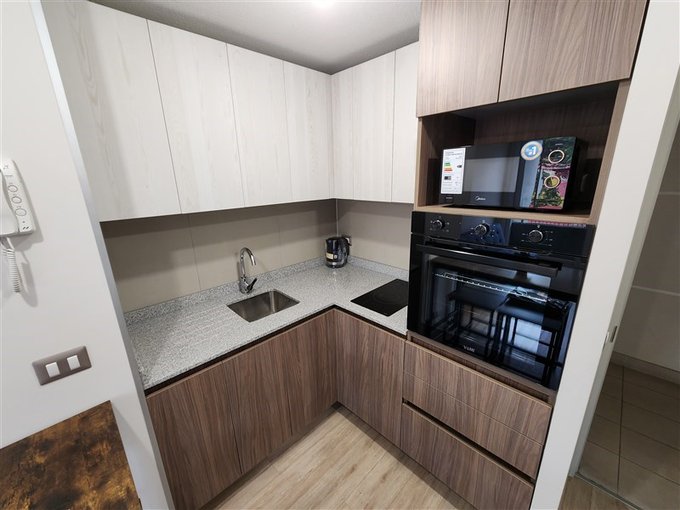 - Cocina americana con encimera de vitrocerámica, campana y horno.
