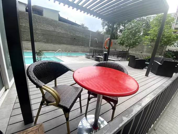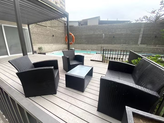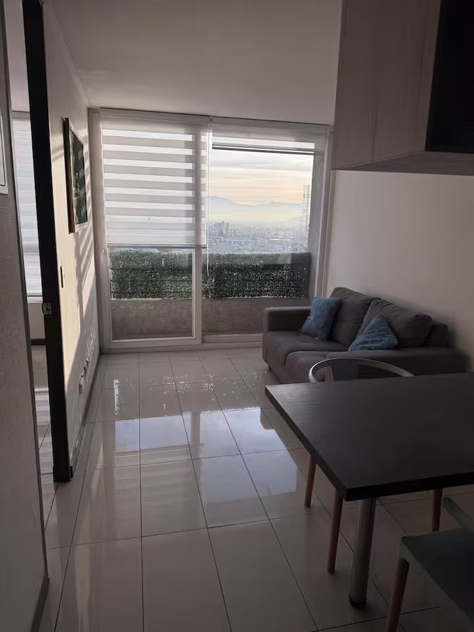 Departamento semi amoblado céntrico en Santiago de Chile. Living/comedor con mesa, sillon, balcón con vista a la ciudad y montañas, baño en suite.