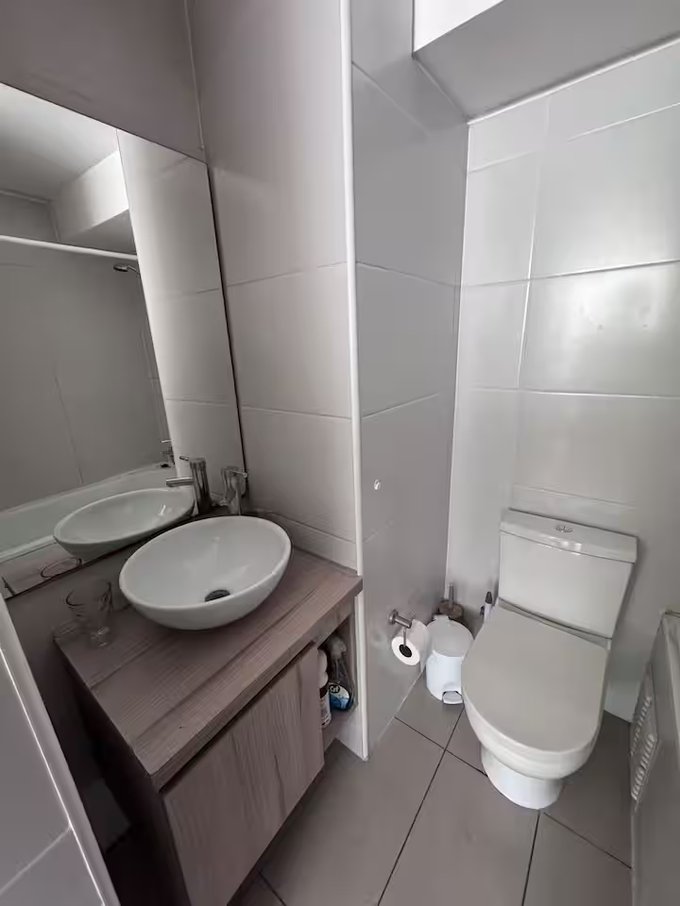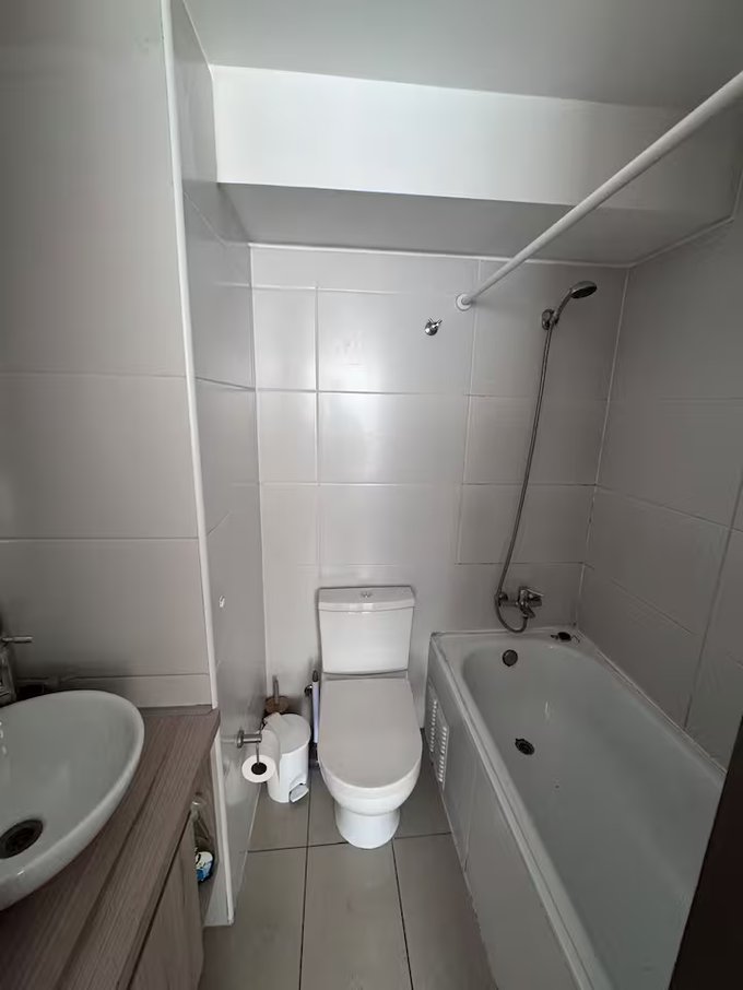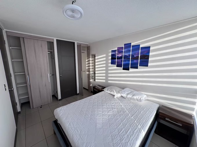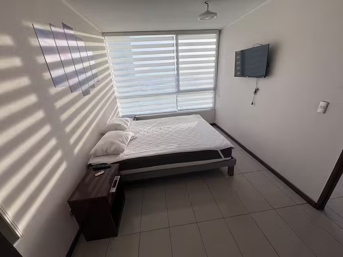 Departamento con dos ambientes, al ingresar encuentras living comedor, cocina americana, mesa, sillón y terraza con hermosa vista. Puerta da acceso a un amplio dormitorio con una cama de dos plazas (reemplazable), veladores, dos closet y baño en suite con tina.
