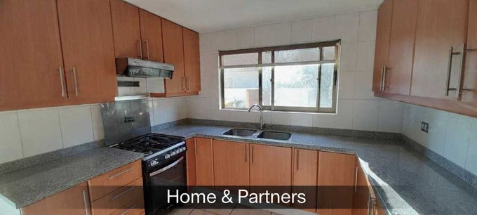 Cocina moderna y funcional amoblada, equipada con encimera a gas, cubierta de granito gris y muebles empotrados. Conectada a logia exterior con salida a patio lateral, piso cerámico.