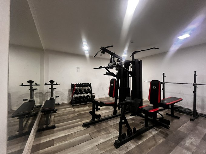 El edificio cuenta 4 torres de 4 pisos, con espacios comunes como sala multiuso, gimnasio, azotea, zona de quinchos, plaza de juegos aéreo, estacionamientos de visita, zona de reciclaje y espacios verdes.