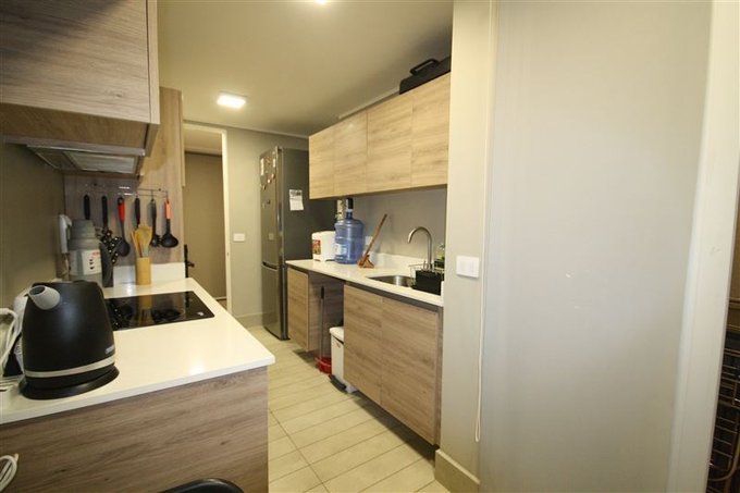 Cocina equipada con encimera, horno y campana, espacio conectado a cómoda logia con lavadero, todo conectado a caldera eléctrica para el agua caliente.