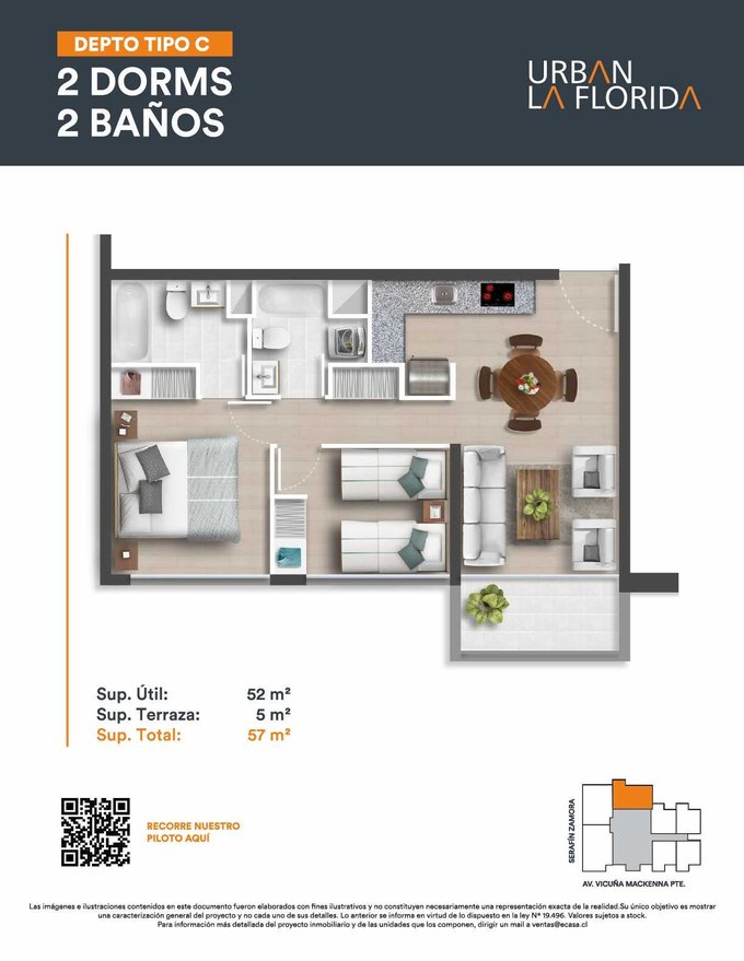 Este elegante y moderno departamento en arriendo te espera en la vibrante Av. Vicuña Mackenna 7189/La Florida. Con 2 acogedores dormitorios y 2 baños perfectamente distribuidos en 57m construidos, encontrarás el espacio ideal para tu comodidad. Disfruta de tus momentos de relajación en la terraza de 2m y vive en un entorno seguro y con todas las comodidades.