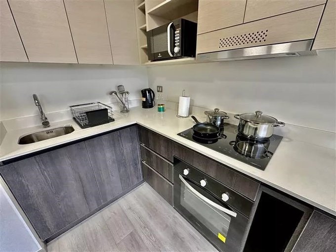 Cocina equipada con cubierta de granito y todos los utensilios de cocina.