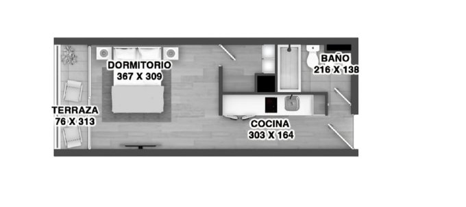 Ambiente eficiente y bien distribuido: 30 m totales con 1 baño , balcón para disfrutar del aire libre y orientación sur . Cocina con cubierta de cuarzo blanco , ventanas con marco de aluminio y termopanel para mejor aislación . Piso vinílico en cocina y comedor y cerámica en baño y terraza . Incluye walk-in clóset para excelente almacenaje .