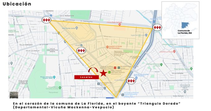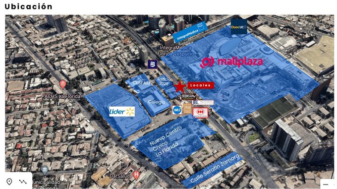 Locales emplazados en un sector comercial consolidado, a pasos del Metro y con alta densidad residencial. Frente a Mall Plaza Vespucio y cercano al Colegio Bellavista (más de 2.000 personas entre estudiantes, docentes y funcionarios), CESFAM, notaría, Integramédica, Duoc UC y la nueva Plaza Cívica de La Florida. Excelente accesibilidad y conectividad, a pocos minutos de la estación Bellavista de La Florida y con paraderos de Red/Transantiago en las inmediaciones.