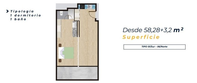 Departamento 1D/1B, 2 ambientes, 58.61 m totales y terraza ideal para relajarte al aire libre . Piso 23 en edificio de 24 pisos, con envidiable vista orientación sur.