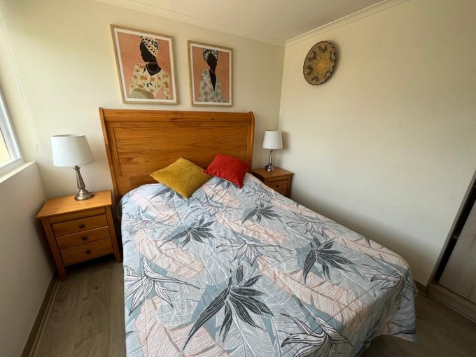 El departamento cuenta con 2 dormitorios, 1 baño, living-comedor y cocina integrada. El condominio dispone de acceso controlado, piscina, áreas verdes, juegos infantiles y estacionamientos de visita, ofreciendo un entorno tranquilo y seguro.
