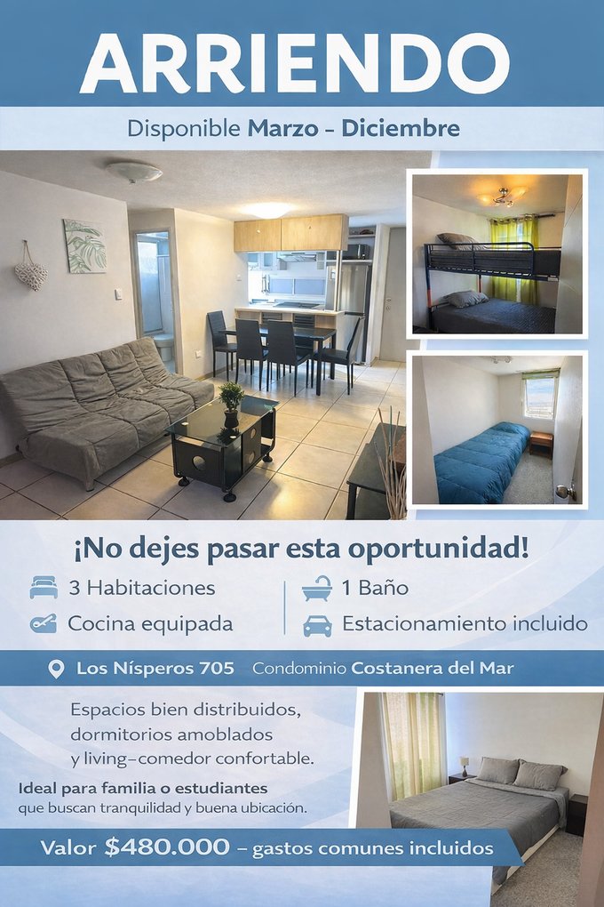 Cocina comedor, living, estacionamiento, incluye internet