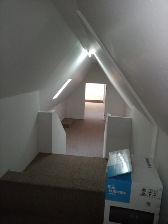 Ampla escala de subida al segundo piso, donde hay sala estar, dormitorios y baños