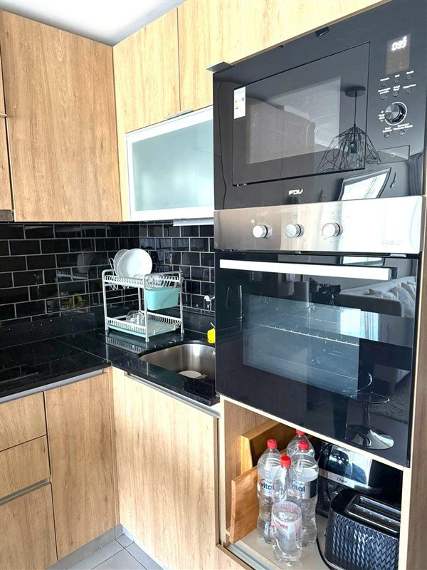 encimera vitrocerámica, horno empotrado y microondas HDV, cubiertas de granito negro.