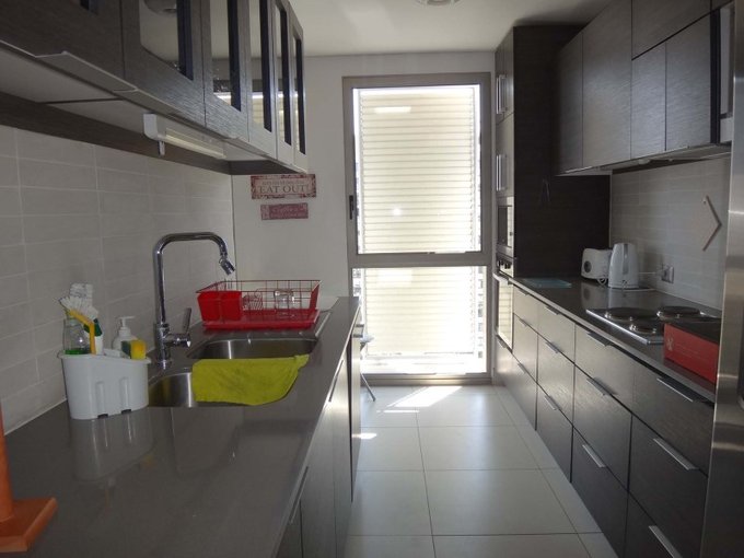 Piso de madera en todo el departamento, cocina equipada (campana, encimera, horno empotrado y lavavajillas), ventanas termopanel y quebravistas
