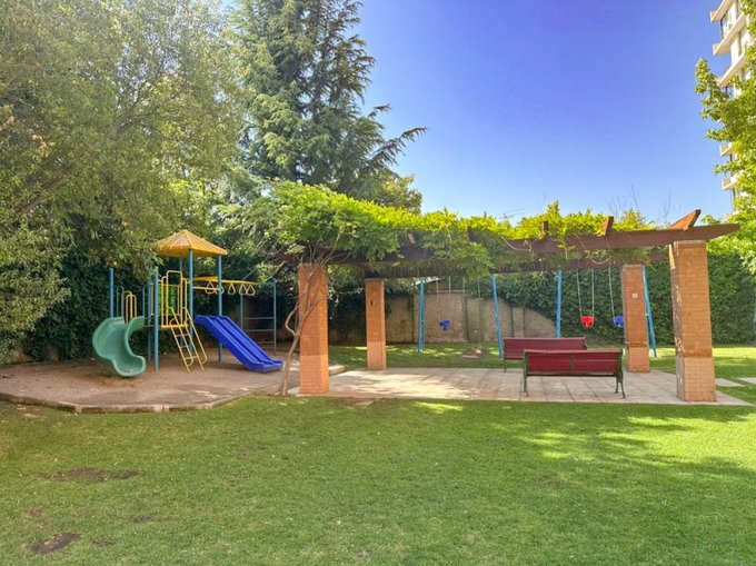 El edificio es moderno (2007) y cuenta con piscina, extensas áreas verdes, juegos infantiles, conserjería, entre otros.