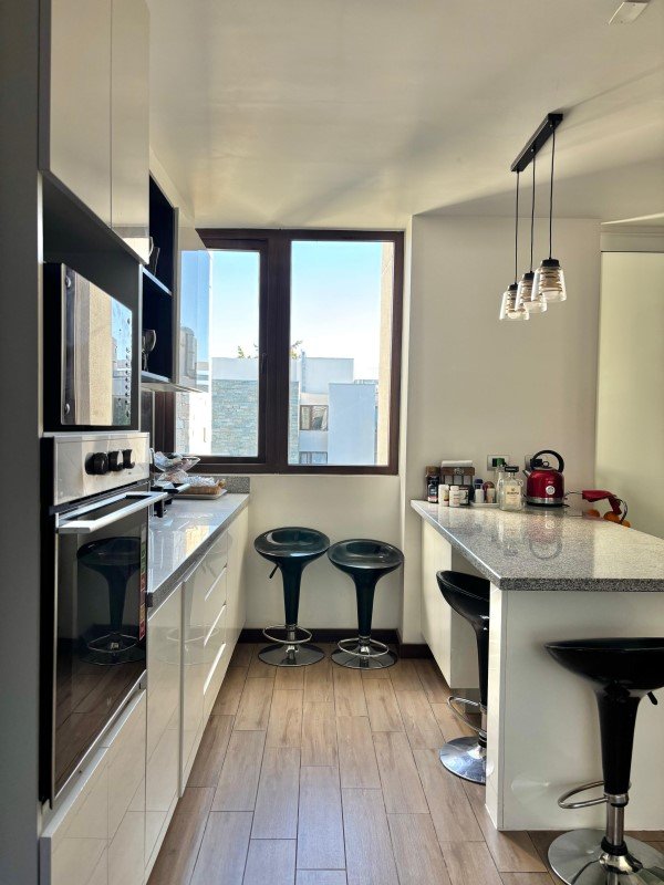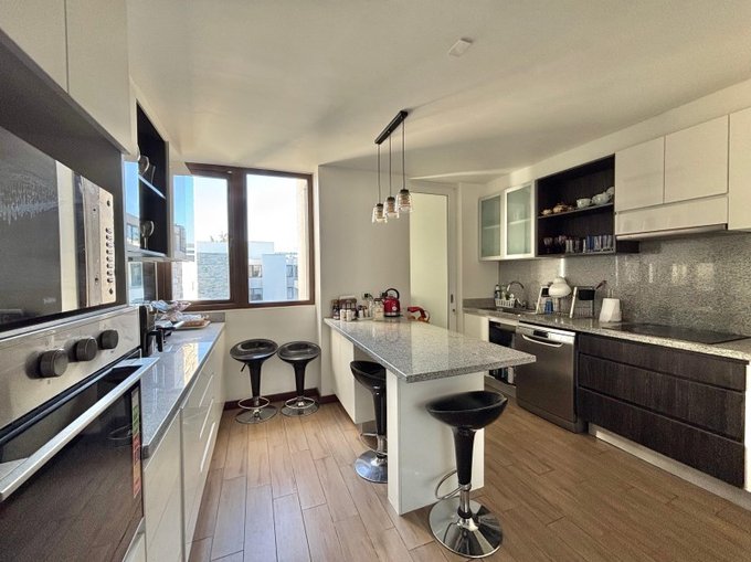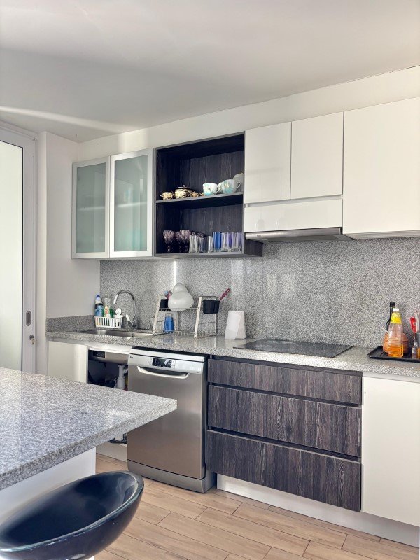 Cocina amoblada y equipada: plataforma granito, encimera vitro, horno, campana lavavajillas