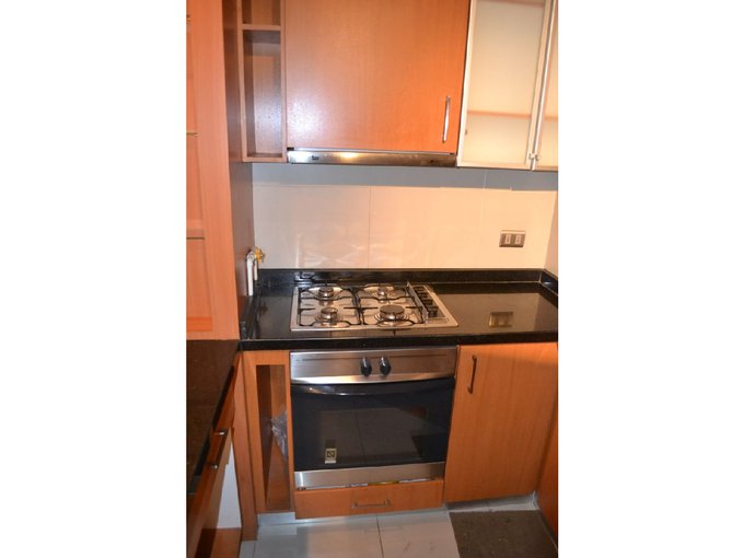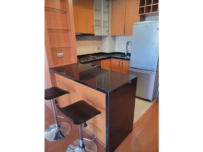 1 dormitorio con salida a terraza, walk in closet, baño, cocina americana amoblada con refrigerador, encimera, horno eléctrico y microondas.