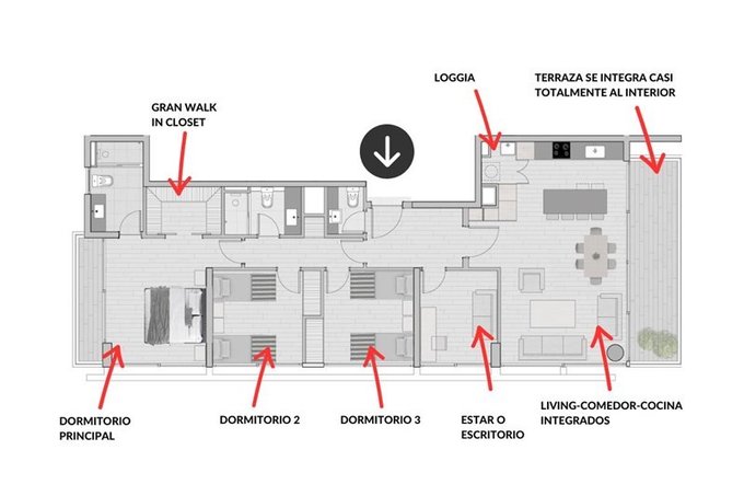 Living y comedor integrados, con salida a una de las terrazas