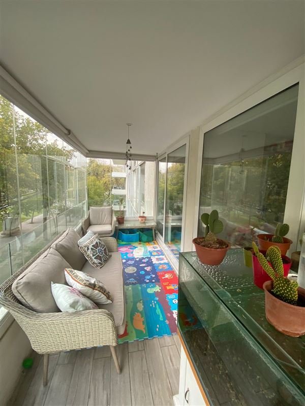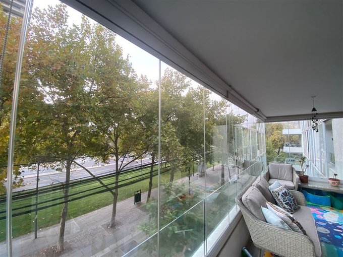Terraza con vidrios plegables obteniendo así un espacio para usar en verano y invierno.