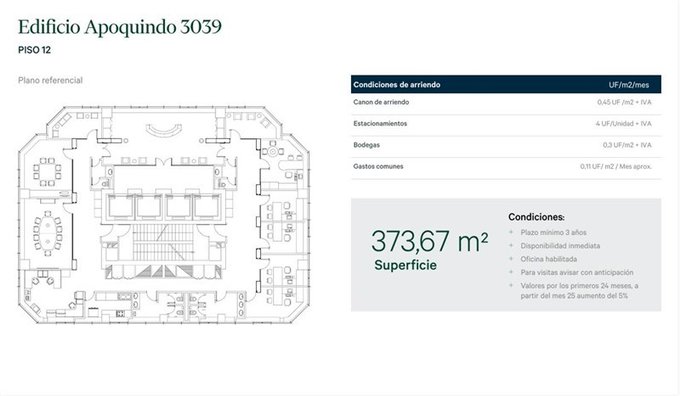 La ubicación en Avenida Apoquindo - Augusto Leguía asegura una conexión inmejorable con el resto de la ciudad, permitiendo un fácil acceso a transporte público y una amplia variedad de servicios en los alrededores. Además, la orientación Nor-Oriente brinda una excelente iluminación natural durante todo el día. Esta oficina se arrienda en UF 0,45/m2 con un canon mensual de UF 168,15