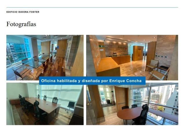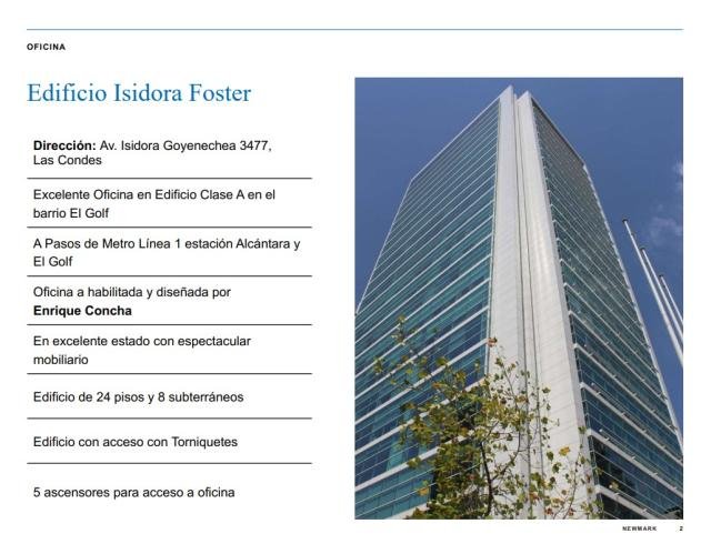ProCasa La Dehesa (Oficina Carloshurtado Propiedades) ARRIENDA excelente OFICINA en el corazón del Barrio El Golf en la Comuna de las Condes. Posee una ubicación privilegia y su conectividad con autopistas y calles que dirigen hacia distintos puntos de la ciudad, destacando sus tres accesos vehiculares (Avda. Vitacura, Isidora Goyenechea y Avda. Andrés Bello). El proyecto cuenta con certificación LEED Gold y es líder en conservación de energía y diseño ambiental, destacando sus características técnicas enfocadas en el ahorro de energía y en la reducción del impacto ambiental. DESCRIPCIÓN OFICINA 100-A (Piso 1) ? Superficie: 287 m ? Canon de arriendo: UF 0.69 + IVA por m ? Valor de arriendo mensual: UF 198.03 + IVA ? Valor estimado en pesos: $ 7.370.000 + IVA ? Valor estacionamientos: UF 4.00 + IVA c/u ? Disponibilidad: Octubre 2024 ? Condiciones de entrega: Planta habilitada ? Gastos Comunes: UF 0.11 por m DESCRIPCIÓN EDIFICIO TORRE ISIDORA FOSTER * Edificio de 523 pisos * Superficie total: 14.000 m Área útil * 5 ascensores de alta velocidad * Estructura antisísmica con disipadores de energía * Alto sistema de seguridad asociado * Muro cortina de alta eficiencia, que maximiza la entrada de luz natural y minimiza la radiación solar * Climatización independiente para cuarto de piso que permite el funcionamiento sectorizado según las diferentes necesidades Superficies y características han sido proporcionadas por el propietario y están sujetas a confirmación. No deje de visitar! . Código interno ProCasa: 66090