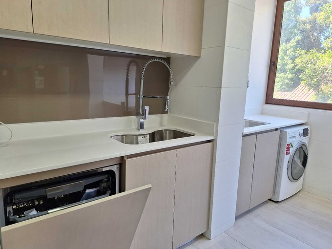 Cocina amoblada, con comedor de diario y equipada con horno y microondas empotrados, campana, encimera vitrocerámica, lavavajillas, lavadora.