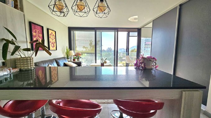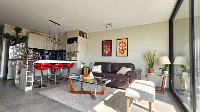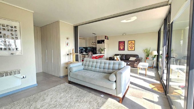 Este departamento cuenta con una superficie total de 81 m y una superficie útil de 71 m. Dispone de dos dormitorios y dos baños, ofreciendo una distribución funcional y espacios definidos para cada ambiente. El living se vincula con una amplia terraza a través de ventanales, permitiendo la conexión con el exterior y vistas despejadas. La cocina está equipada y se integra con el área social mediante un mesón de granito, potenciando el uso de los espacios comunes.