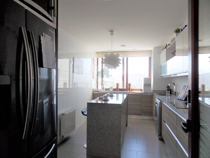 Cocina moderna con isla amoblada con vista a la cordillera.