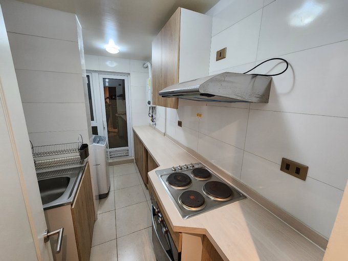 * Cocina amoblada y equipada, encimera, horno, campana y microondas.