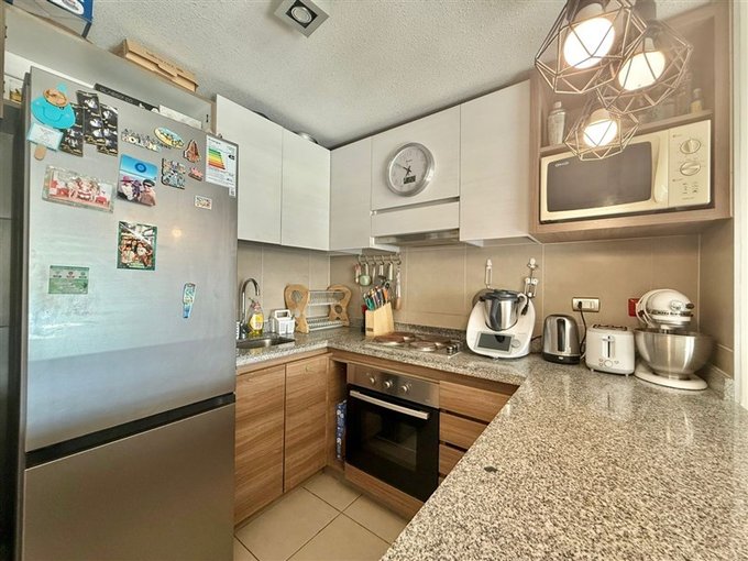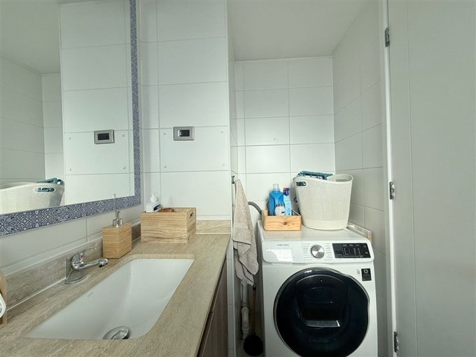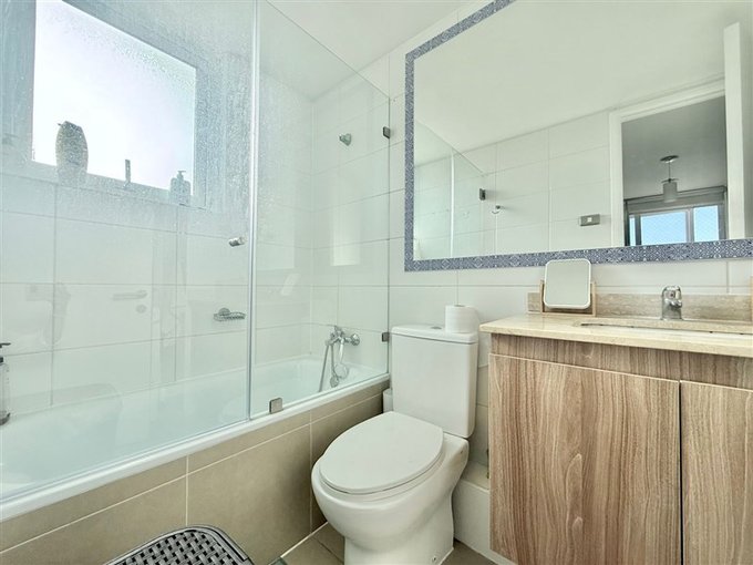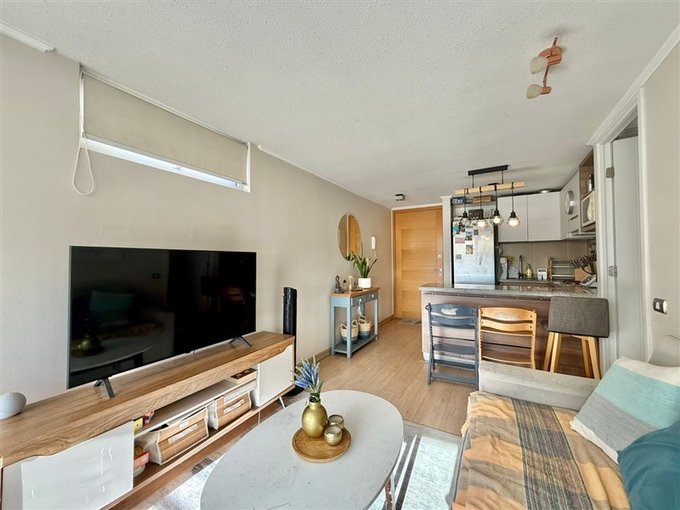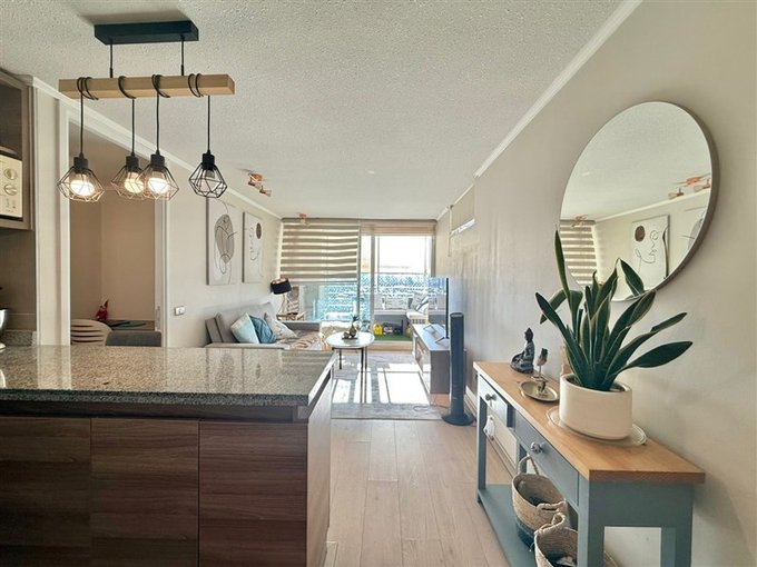 La distribución contempla dormitorio principal en suite con walk-in closet y acceso a terraza cerrada; segundo dormitorio con espacio para cama de dos plazas o escritorio (ideal para home office); 2 baños completos con tina y conexión para lavadora; living comedor con salida a terraza cerrada; cocina americana con cubierta de granito, equipada con artefactos eléctricos y mesón extensible tipo comedor diario. El departamento dispone de 2 terrazas: una en living y otra en dormitorio principal.